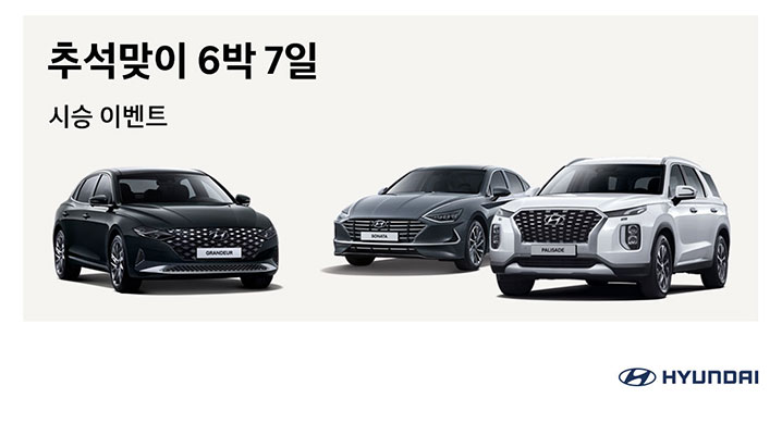 현대자동차는 민족 대명절 추석을 앞두고 총 250대의 귀성 차량을 무상 대여해주는 '추석 맞이 6박 7일 렌탈 시승 이벤트'를 실시한다고 4일(금) 밝혔다.