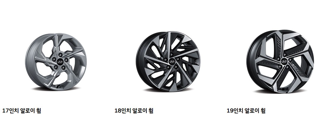 4세대 투싼은 가장 기본 트림부터 17인치 휠이 적용된다. 그 위로 18, 19인치 휠을 선택할 수 있지만, 모던 트림에서는 최대 18인치 옵션까지 선택이 가능하다. 전체 휠은 방향성이 있는 디자인을 채택해 멈춰 있어도 역동적인 모습이 느껴지는 모습이다.
