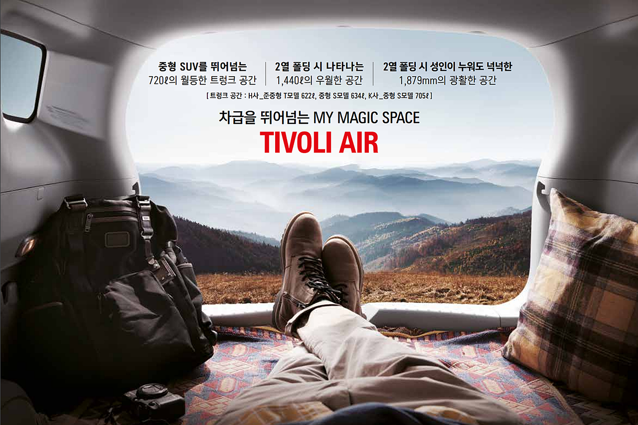 티볼리 에어의 적재공간은 2열을 폴딩 했을 때 진가를 발휘한다. 2열을 폴딩 했을 시 적재용량은 1,440L로 늘어나며, 길이는 1,879mm까지 늘어나 185cm 성인 남성도 편하게 누울 수 있는 공간이 확보된다. 바닥까지 완전히 평평하게 폴딩이 되기 때문에 차박을 위해 추가적으로 평탄화 작업을 할 필요가 없다. 또한 단순히 길이만 길어진 것뿐만 아니라 일반 티볼리 대비 전고도 30mm 늘어나 한결 여유로운 차박이 가능하다.