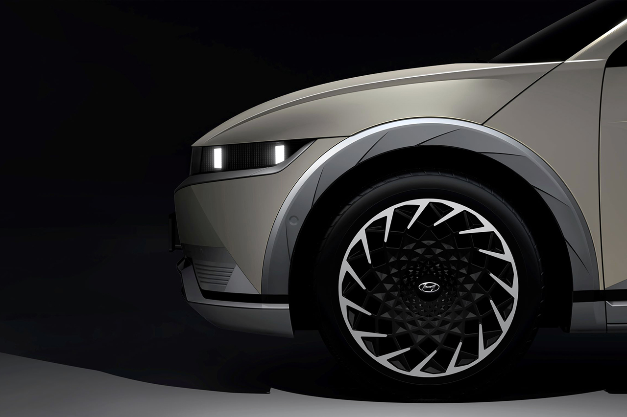 아이오닉 5의 전면에는 현대자동차 최초로 상단부 전체를 감싸는 클램쉘 후드를 적용해 면과 면이 만나 선으로 나눠지는 파팅 라인을 최소화함으로써 유려하면서도 하이테크적인 인상을 완성했고, 측면부는 현대자동차 전기차의 역대 최대 직경인 20인치 공기 역학 구조를 적용한 휠을 탑재해 완벽한 전기차 비율을 구현했다.