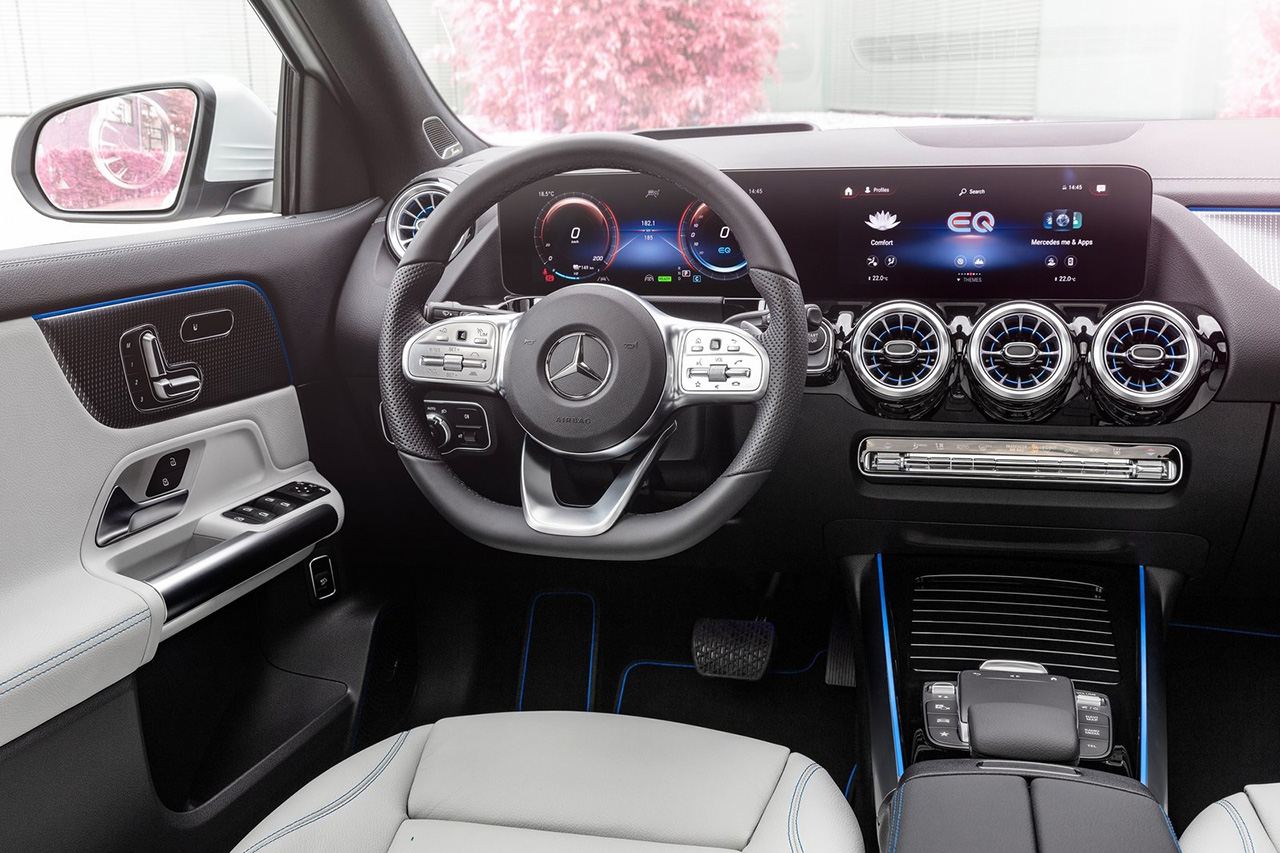 실내는 최신 벤츠 모델의 레이아웃을 유지하는 동시에 다양한 요소들이 적용되었다. 새로운 스타일의 백라이트 트림과 통풍구, 좌석 및 차량 열쇠에 적용된 로즈골드 포인트다. 로즈골드 색상 포인트는 휠에도 적용되었는데, 벤츠 EQC부터 사용되던 포인트가 EQA까지 이어졌다. 또한 EQA에 탑재된 MBUX 인포테인먼트 시스템은 충전 옵션, 전력 소비 및 에너지 흐름과 같은 전기차에 핵심적인 요소를 확인할 수 있으며, 계기판에는 배터리 잔량과 주행 가능 거리를 확인할 수 있다. 계기판 스타일은 총 네 가지로 모던 클래식, 스포츠, 프로그레시브, 디스크리트 중 운전자의 취향에 따라 선택 가능하다.