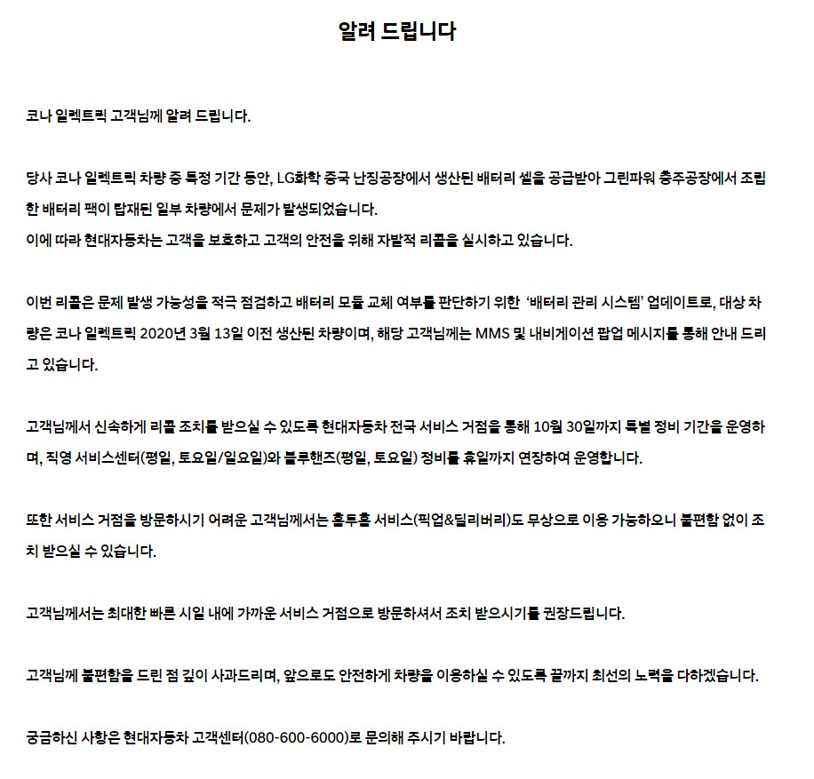 이후 현대차는 충전 중 지속적으로 발생하는 코나 일렉트릭의 화재 발생으로 인해 지난해 10월부터 배터리 관리 시스템(BMS)을 업데이트하는 리콜을 시행했다. 리콜 내용은 배터리 운영 조건을 완화하고, 과도한 셀 간 전압 편차가 발생하는 등 이상 징후가 발생할 경우 충전을 멈추고, 시동이 걸리지 않도록 조치하는 것이다. 하지만 이번 화재 사고 차량은 해당 리콜 조치를 받은 차량으로 리콜이 정말 화재 예방에 효과가 있는지 논란이 있을 것으로 예상된다.