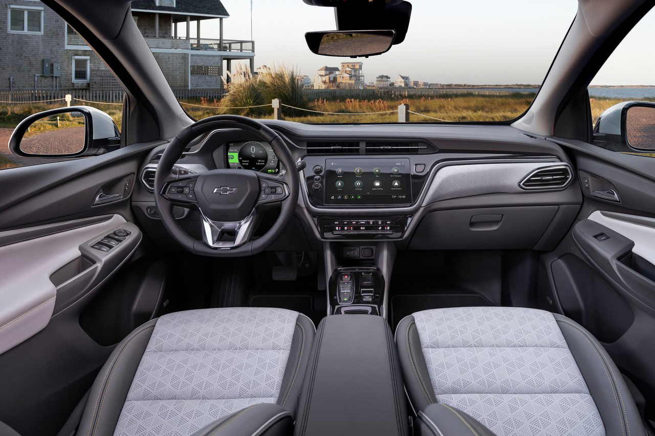 실내 레이아웃은 기존 볼트 EV와 유사한 모습이지만, 곳곳에 디테일한 변화를 줬다. 계기판은 비교적 작은 사이즈인 8인치 디지털 계기판이 적용되었고, 인포테인먼트 디스플레이는 10.2인치로 크기가 충분할 뿐만 아니라 무선 카플레이, 안드로이드 오토를 지원한다. 또한 기존의 전자식 변속 레버는 전자식 변속 버튼으로 변경됐다.