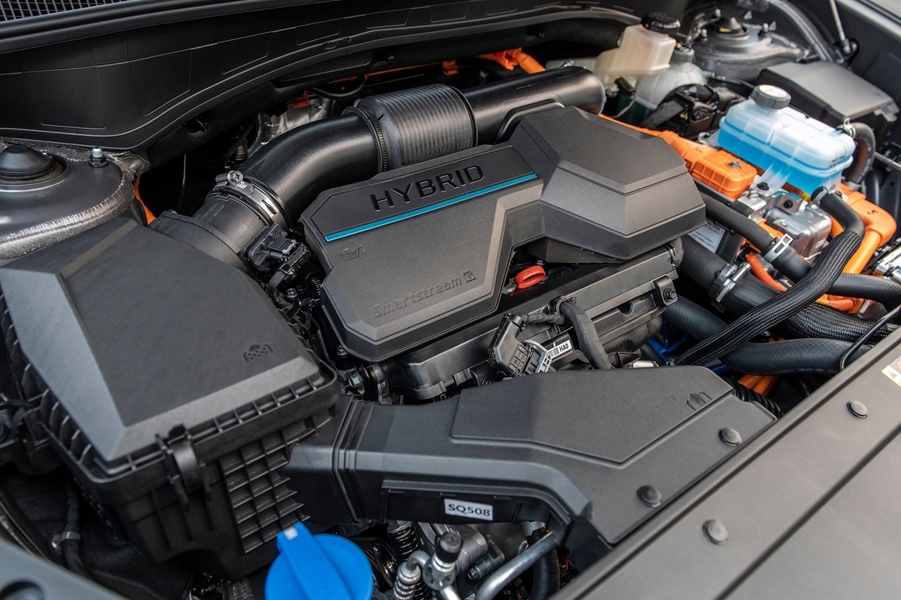 싼타페 하이브리드에 탑재되는 파워트레인은 최고출력 180마력, 최대토크 27kg.m를 발휘하는 1.6리터 가솔린 터보 엔진과 최고출력 60마력(44.2kW), 최대토크 26.9kg.m를 발휘하는 전기모터가 결합되어 시스템 합산 최고출력 230마력, 최대토크 35kg.m를 발휘한다. 6단 자동변속기가 탑재되며, 공인연비는 아직 공개되지 않았다. 하지만 같은 파워트레인을 사용하는 쏘렌토 하이브리드의 공인연비 15.3km/L(17인치 2WD 기준)와 유사할 것으로 예상된다.