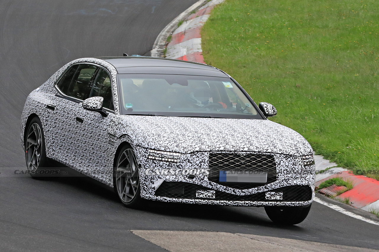 제네시스 차세대 G90 테스트카가 독일 뉘르부르크링 서킷에서 주행 테스트 중 포착됐다. 포착된 G90 테스트카는 기존 두꺼운 위장막 대신 얇은 위장 래핑으로 가려져 디자인 요소 일부를 확인할 수 있다.