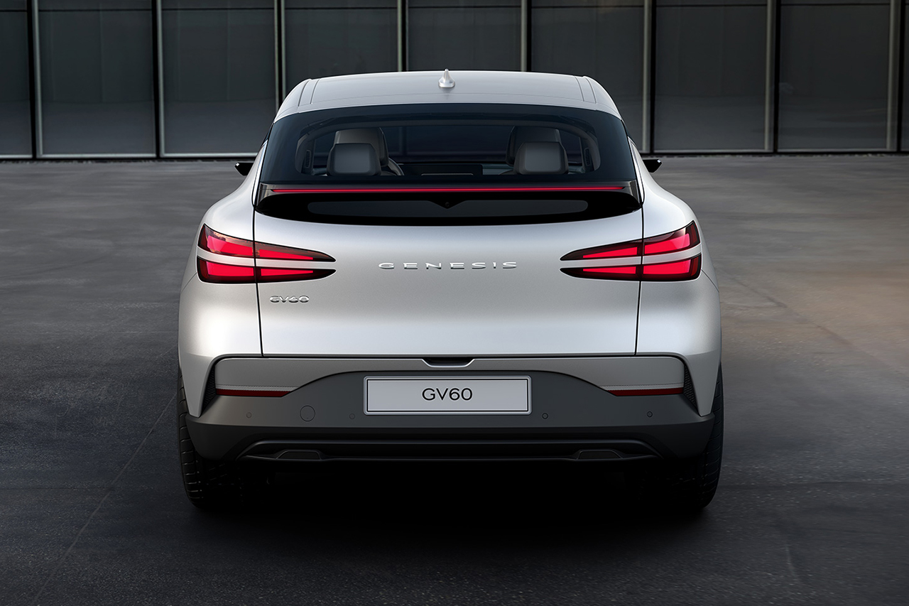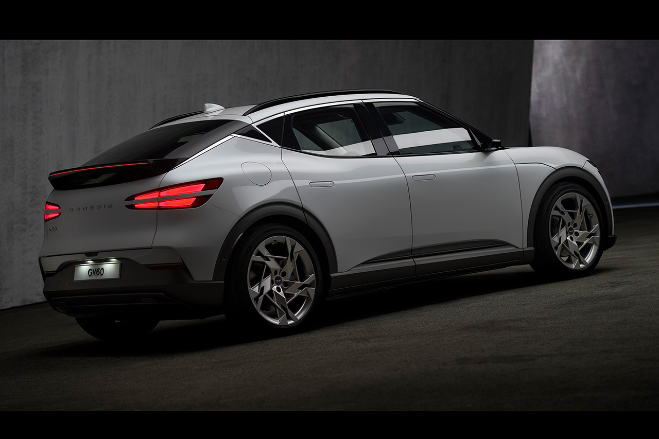 유선형의 루프 라인을 적용한 GV60은 패스트백 스타일의 CUV다. 하단부로 갈수록 입체적인 볼륨감을 강조했고, 21인치의 거대한 휠을 적용해 역동적인 모습을 강조했다. 여기에 C 필러의 독특한 형태의 가니쉬 디자인을 적용해 독특한 멋을 더한다.