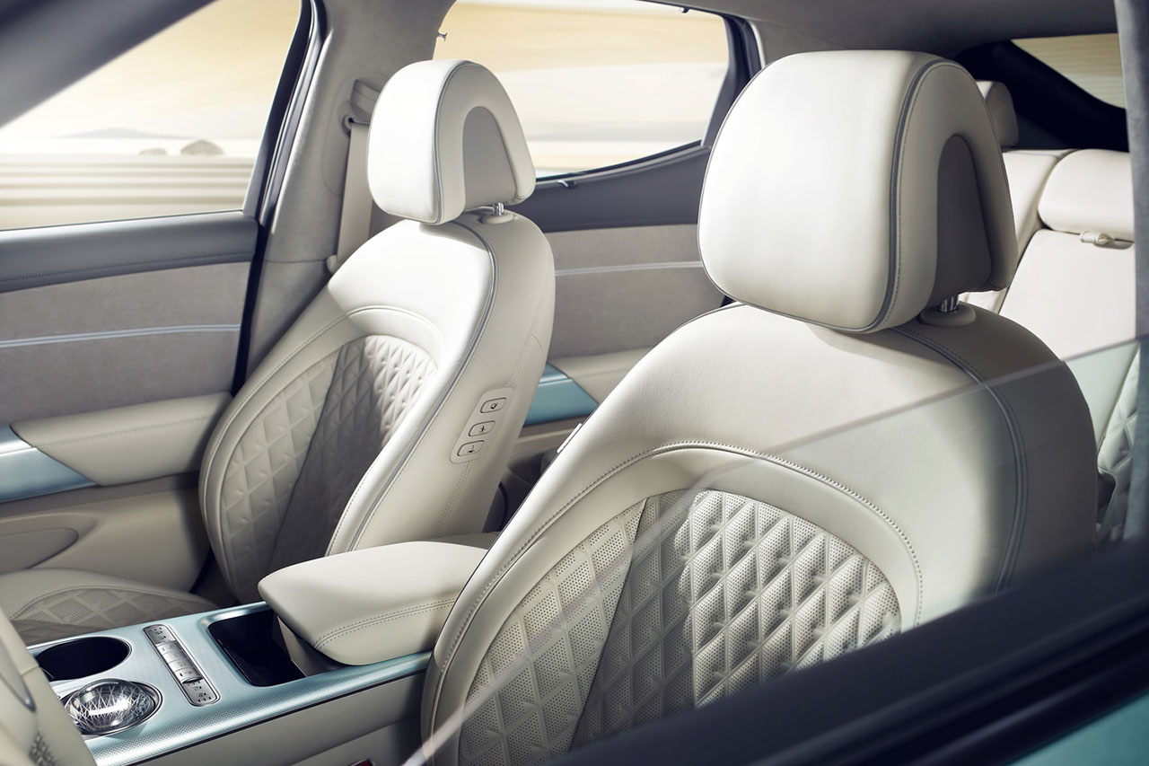 실내는 제네시스 내장 디자인 철학인 ‘여백의 미’를 강조하는 동시에, 플로팅 센터콘솔을 적용해 GV60만의 차별화된 이미지를 구현했다. 또한 구 형상의 크리스탈 스피어(전자식 변속레버)를 적용해 직관적이며, 심미적인 만족감을 선사한다.