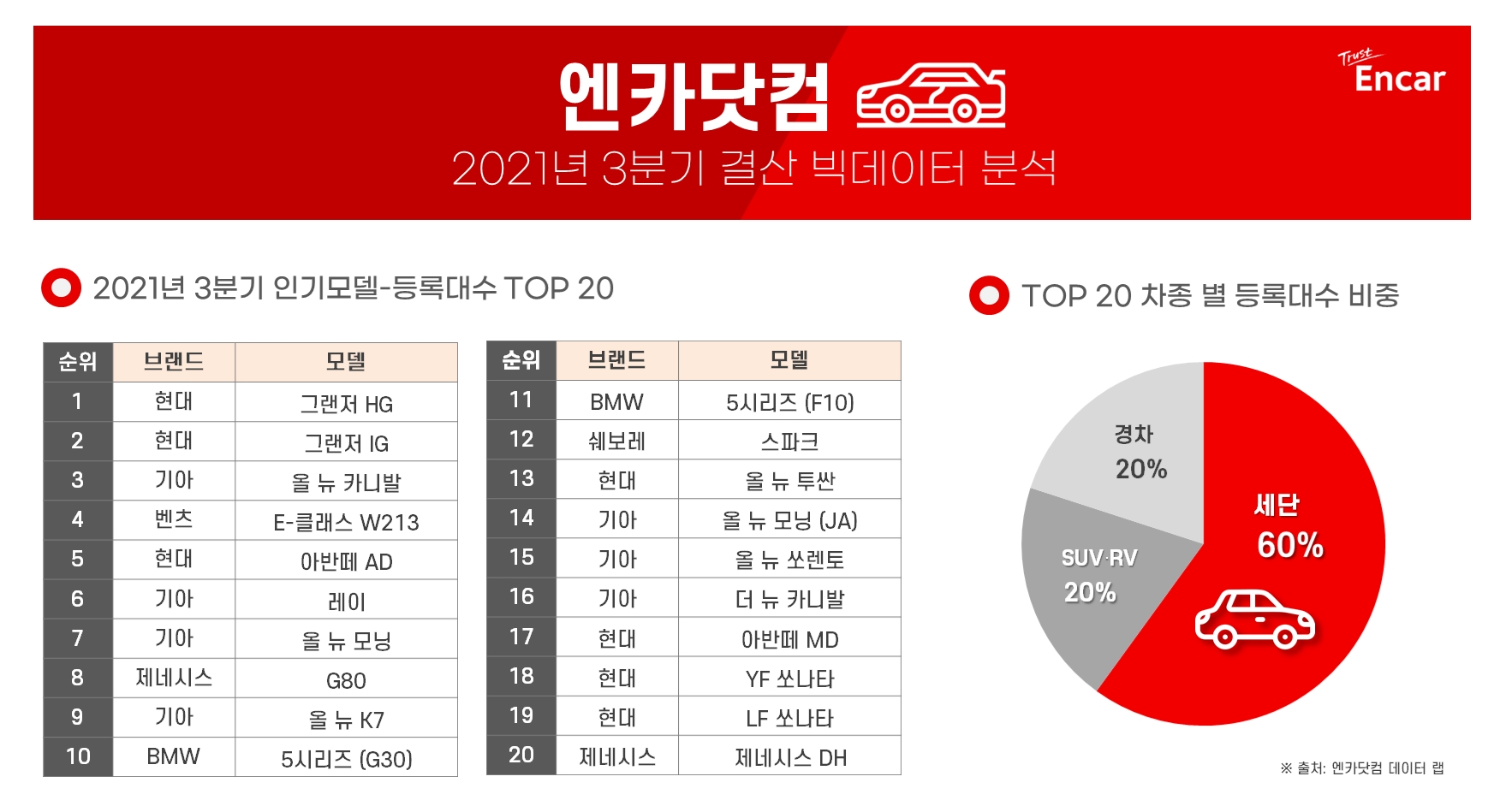 올해 7월부터 9월까지 3분기 등록대수 상위 20위 중 1위 모델은 2017년~2019년에도 등록대수 1위를 차지한 그랜저 HG였으며, 2위도 그랜저 HG 후속 모델인 그랜저 IG가 차지해 국민 세단의 위상을 입증했다. 이어 3위는 올 뉴 카니발, 4위는 E-클래스 W213, 5위는 아반떼 AD였다.
