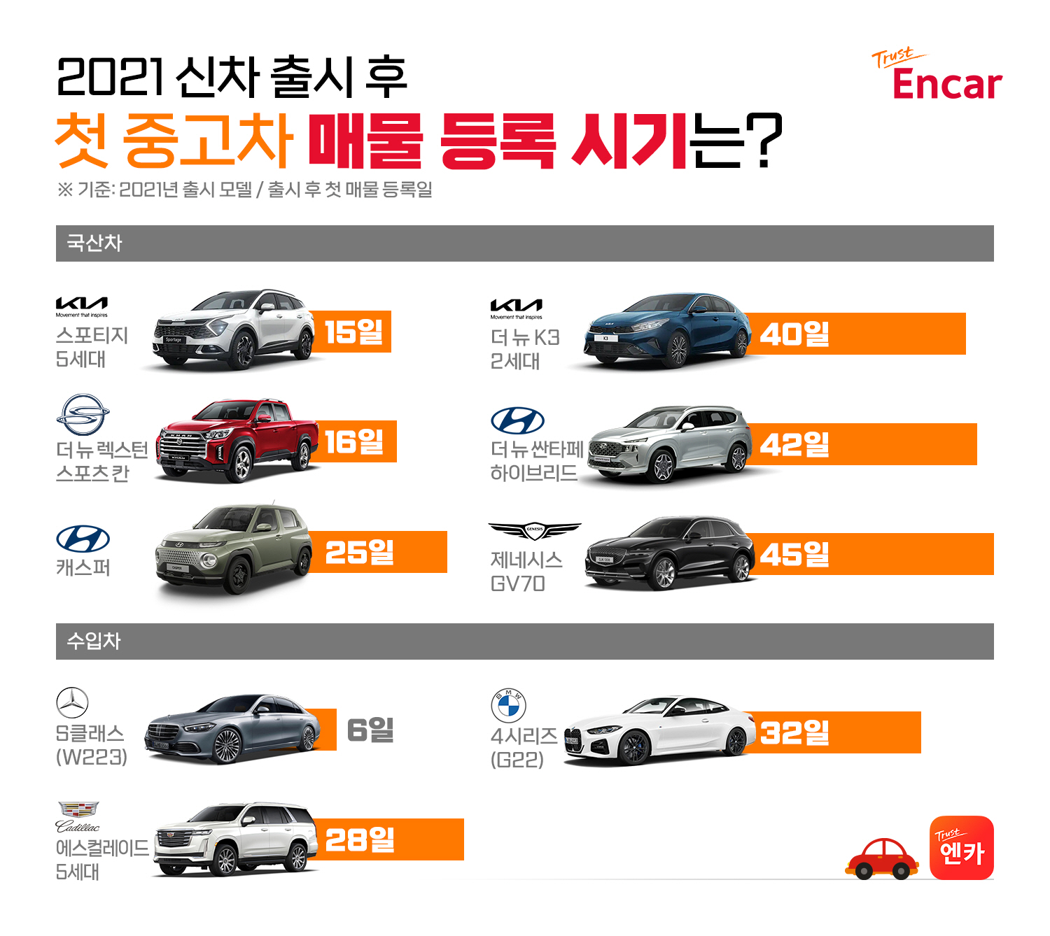 엔카닷컴이 최근 약 1년 간 공식 출시된 인기 신형 모델 9종을 대상으로 엔카닷컴 플랫폼에 출시 이후 중고차 매물로 등록된 최초 시기를 분석했다. 그 결과 국산차는 기아 스포티지 5세대, 수입차는 벤츠 S클래스가 가장 빨리 중고차 첫 매물로 등록됐으며, 가장 최근 출시된 현대 캐스퍼 또한 한 달이 채 안돼 중고차 시장에 오른 것으로 나타났다.