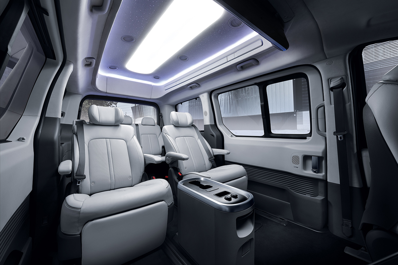실내는 기본 트림의 전고 보다 205mm를 늘리고, 1열에서 2~3열까지 이동 가능한 무버블 콘솔을 적용해 공간 활용성을 극대화했다. 무버블 콘솔에는 팝업식 테이블, 컵홀더, USB C타입 충전 기능도 포함되어 있다. 또한 HDMI/USB 연결, 스마트기기 미러링, 지상파 HD-DMB 시청 기능 등을 갖춘 동급 최대 크기의 25인치 후석 디스플레이를 탑재해 이동중에도 원하는 영상을 감상할 수 있다.