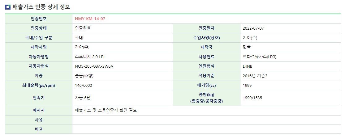 기아 스포티지 LPG가 인증을 완료하고 출시를 앞두고 있습니다. 환경부 자동차 배출가스 및 소음인증시스템에 따르면 7월 7일 기아 스포티지 2.0 LPI 모델의 소음 및 배출가스 인증이 완료됐습니다.